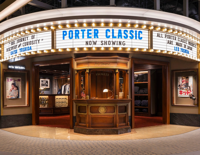 2025.9.12オープン PORTER CLASSICのモノづくりにおける大切なインスピレーションの一つである「映画」。新店舗はこの素晴らしい文化が現代まで続く礎となった、クラシックな映画館をテーマに構築されました。 製作は映画美術監督・種田陽平氏と東宝映像美術チームが担当。圧倒的な表現力で、遊び心あふれる豊かな空間を作り出しました。 店内には、映写機、チケットブース、シアタールーム、アクトレスミラー といった映画・映画館の設備を再現、さらに PORTER CLASSICの愛する名作映画のポスター展示も行われています。映画がお好きな多くの皆様にとっても、心躍る演出、何度でも訪れたくなる仕掛けが散りばめられています。