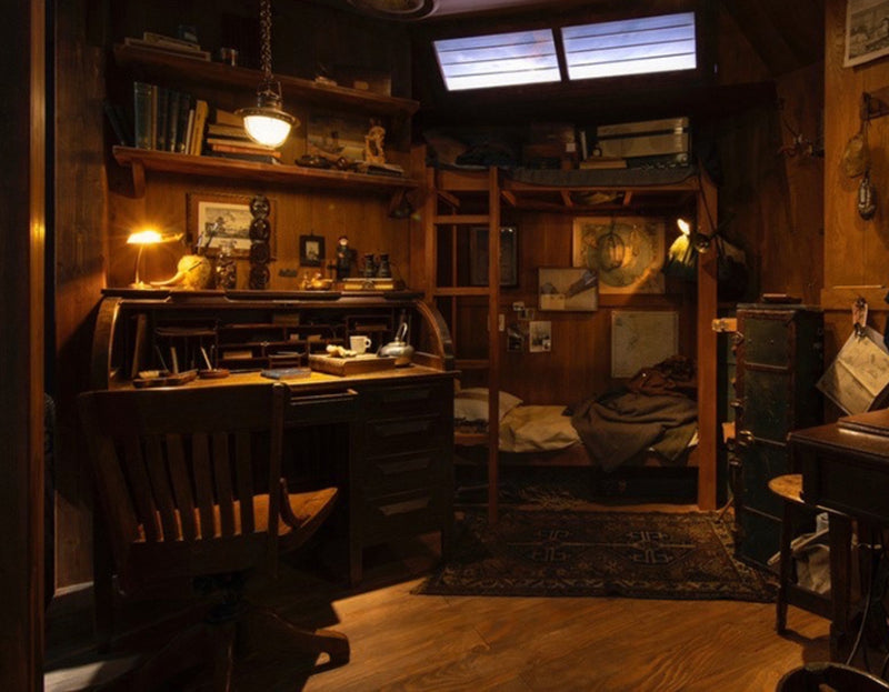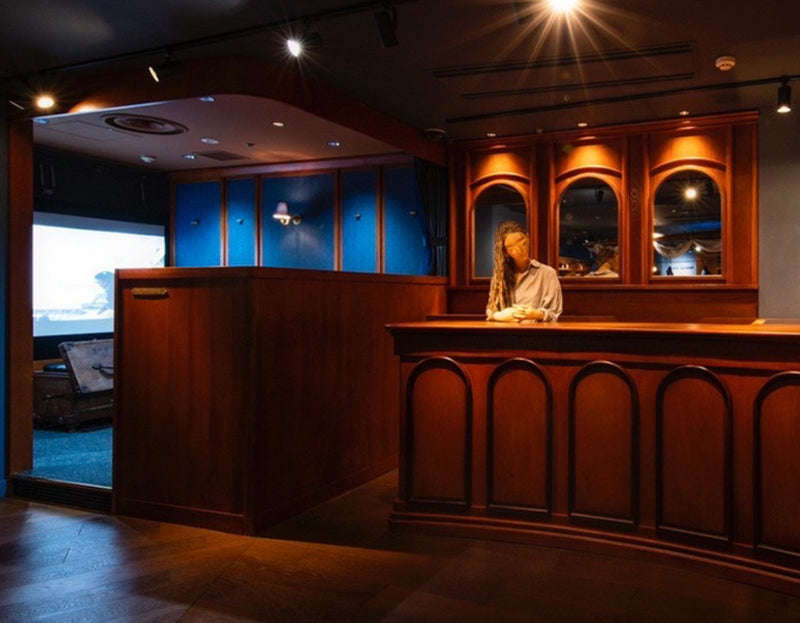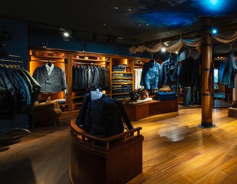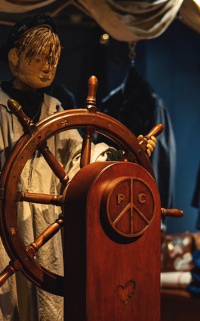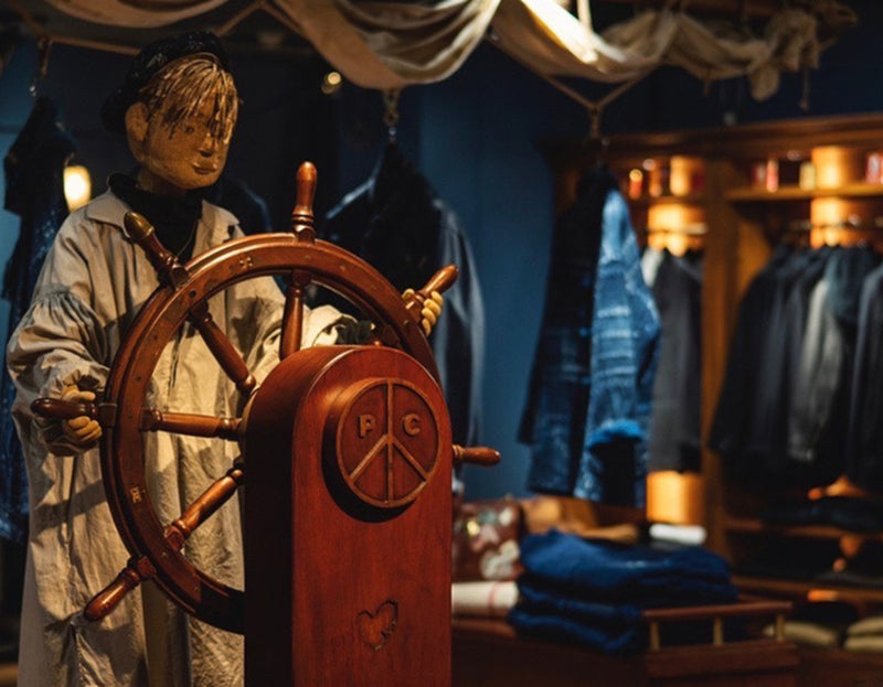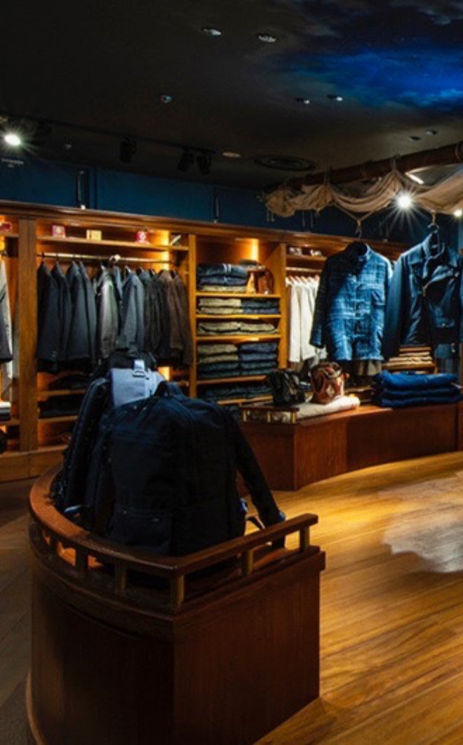 “旅する帆船”がテーマのPORTER CLASSIC 本店。海外でも活動してきた映画 美術監督「種⽥陽平」⽒、⽇本映画の歴史を作ってきた「東宝映像美術」が⼿掛ける、映画のセットのような店舗。約100平⽶の店内には、吉⽥克幸を船⻑に⾒⽴てた「仕事部屋」、お針⼦たちの「アトリエ」、船員たちの「プライベートシアター」等、様々な仕掛けがあり、商品を楽しく体験出来る空間になっている。